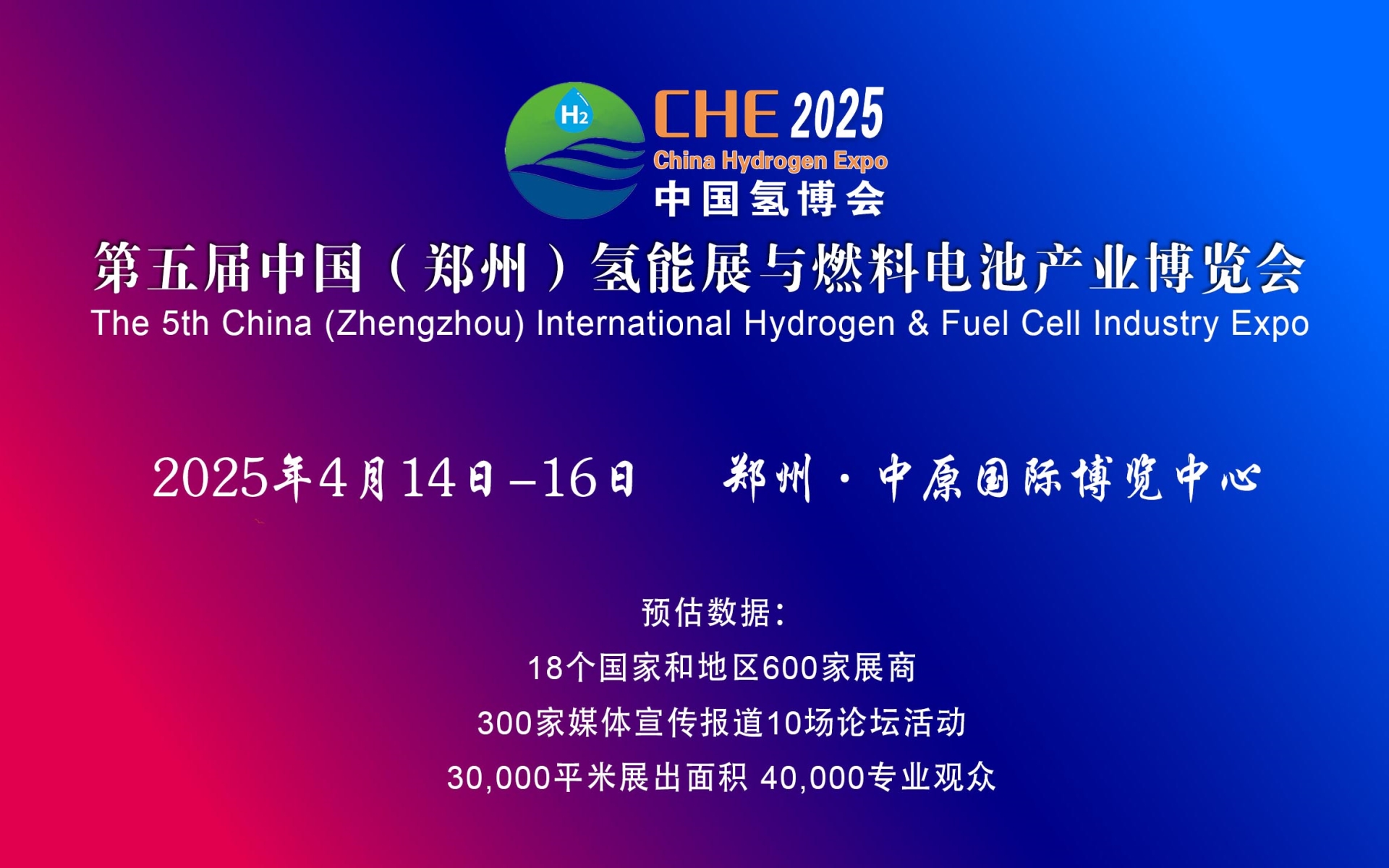 河南是人口大省,农业大省,用能大省,氢能产业在河南拥有巨大的发展空间和潜力。为推动中西部地区氢能产业发展,为企业拓展市场搭建零距离合作对接平台,响应市场需求和政府大力支持,“中国(郑州)国际氢能与燃料电池产业博览会(简称:CHE中原氢博会)”,大会以“氢启未来、能动世界”为主题蓄势待发,为企业提供一场高质量展示交流拓客盛会。召开时间定于2025年4月14-16日在中原国际博览中心举办,届时诚邀您莅临现场参观、参展!