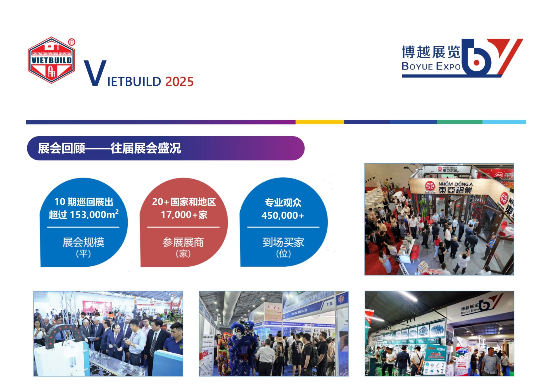 VIETBUILD越南国际建筑建材及家居装饰展览会创办于1997年,已发展为涵盖地产、建材、家装、家居、家电、五金、以及相关领域产品技术设备行业名展。每年定期在越南河内市、胡志明市、岘港市、巡回举办10余期,总规模近1.7万个展位、吸引20多个国家及地区展商及累计约45万人次观众,在越南建筑建材家装领域有广泛、良好之声誉。
