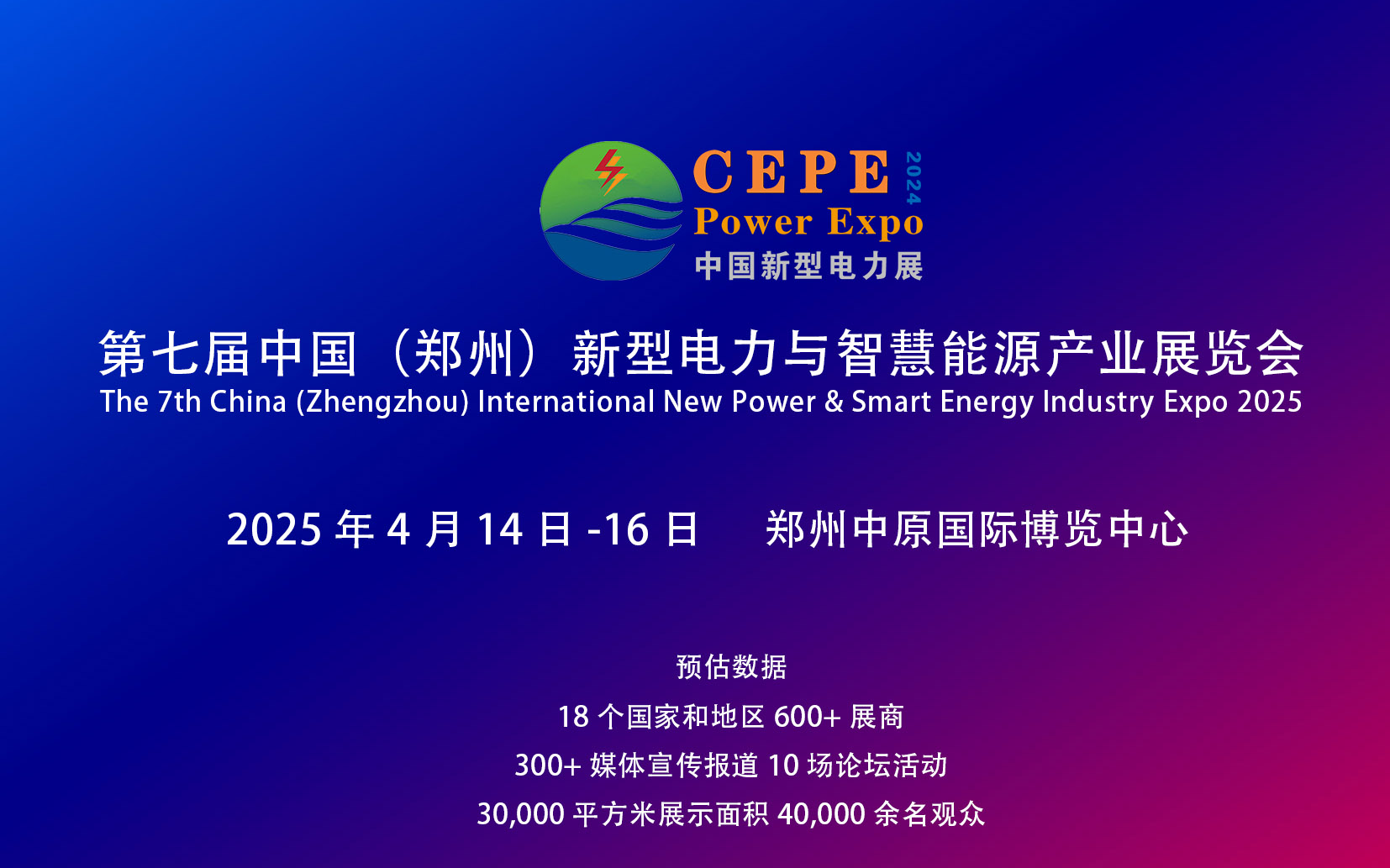 中国(郑州)国际新型电力与智慧能源产业展览会(CEPE),时间定于2025年4月14-16日在中原国际博览中心举办,届时诚邀您莅临现场参观、参展!
