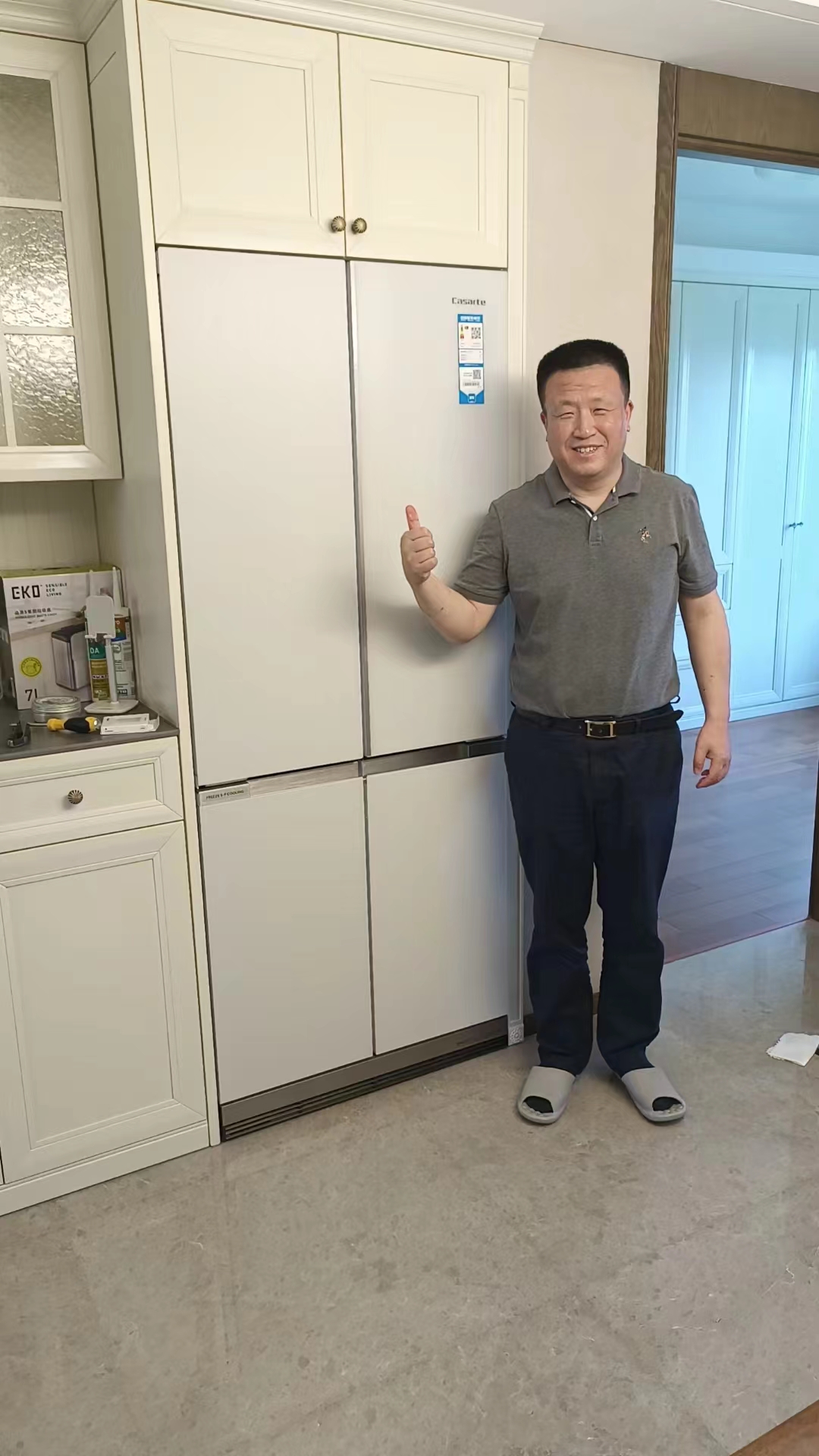 近日,家住南京市玄武区银城东苑的李先生,为本报推荐了一位最美海尔服务兵--孙王峰。经了解获悉,前几天海尔服务兵孙王峰为李先生家的冰箱清洗的时候,了解到一件令李先生犯愁的事情:李先生刚在江心洲买了新房,在装修过程中把橱柜的尺寸和预定冰箱的尺寸弄错了,导致预定的冰箱放不进去,孙师傅看出了李先生的烦心事,说:“李先生不要着急,一会儿清洗完冰箱后,我过去给您看看!”清洗完冰箱后,孙师傅开车拉着李先生来到新居,拿出米尺反复测量距离,查阅卡萨帝冰箱的尺寸,最终选出了卡萨帝BCD-501WGCTDM4GCU1冰箱,为了完美嵌入,孙师傅还帮李先生把吊柜做了微改,经过一个下午的努力,困惑李先生的烦恼终于得到了解决,当冰箱安装完后,李先生为卡萨帝服务竖起了大拇指,在李先生的影响下,左邻右舍都选购了卡萨帝冰箱!
