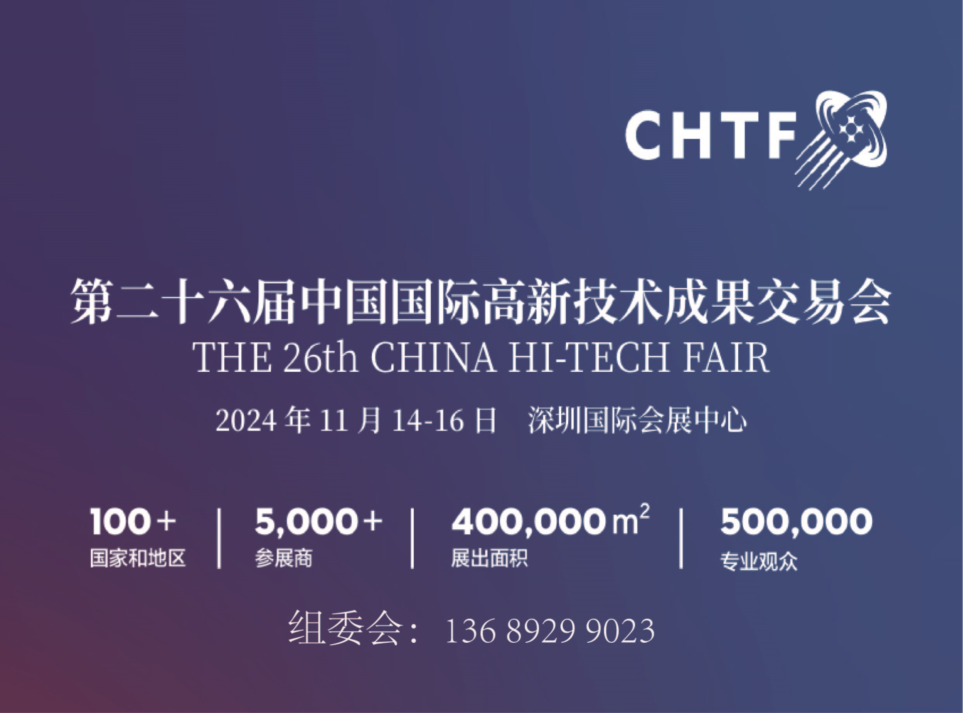 衷心感谢贵单位长期以来对中国国际高新技术成果交易会(以下简称高交会)的关心关注和大力支持! 高交会是经国务院批准,由商务部、科技部、工业和信息化部、国家发展改革委、农业农村部、国家知识产权局、中国科学院、中国工程院与深圳市人民政府共同主办的国家级、国际性高新技术成果交易会。自1999年以来,高交会已成功举办25届,成为国家创新体系的重要组成部分,是我国高新技术领域对外开放的重要窗口和高新技术成果交流交易的重要平台。 第二十六届中国国际高新技术成果交易会经国务院批准,由深圳市人民政府主办,将于2024年11月14日—16日在深圳举办,展览面积约40万平方米,预计将有来自100余个国家和地区的5000余家知名企业与国际组织参展。本届展会共设置国际科技展、未来科技展、国之重器重大装备展、科技巨头产业链展、半导体与集成电路展、电子信息与大数据展、人工智能与机器人展、低空经济与空天展、高端装备制造展、专精特新展、新能源汽车展、高端医疗器械展、生物科技医药展、新材料展、节能环保和绿色低碳展等多个专业展,全方位展示世界高新技术发展趋势,发布高新技术最新成果,在全球范围内进行高新技术成果交易与洽谈。 “科技立国,国运所在,国脉所系,国昌所依。”高交会是中国高新技术领域历史最长、最具影响力的国际性科技盛会。自诞生之日起,高交会肩负着科技兴国的重大使命,为推动高新企业提升国际竞争力、促进国际经济与科技交流合作发挥着重要作用。 当前,世界百年未有之大变局加速演进,新一轮科技革命和产业变革已经到来。在中国深圳举办的高交会,是国家科技重器宣传展示的第一平台,是成为世界级高科技企业的第一平台,是中国科技企业走向全球的第一平台。“中国科技第一展”现诚挚邀请贵单位与相关负责人参展参会。