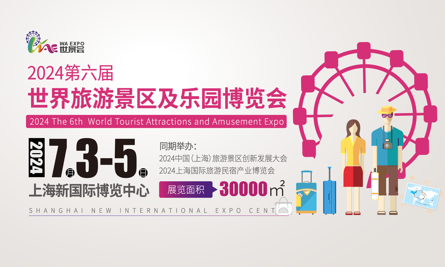 F展会介绍 世界向新、景造未来 2024第六届世界旅游景区及乐园博览会(WAE) 将于2024年7月3-5日在上海新国际博览中心召开, 以“世界向新、景造未来”为主题,将持续打造高质量、高水平的旅游景区及乐园建设与运营采购盛会。每届汇聚300家海内外顶尖品牌企业,接待超过4万名专业观众,是以全题材、全产业链为鲜明特色的全球性旅游景区及乐园博览会。展出面积3万平米,展品范围将涵盖集景区景点、乐园、旅游度假区、旅游示范区、智慧景区装备、无动力设施、户外旅游等产业链头部品牌服务商及设备生产企业,是产业新趋势、新模式、新市场的发布平台。展会顺应行业发展潮流,实施创新驱动战略,加强人工智能、大数据、虚拟现实等在产品中的应用,为全面贯彻落实高质量发展理念,探索行业发展新模式,拓宽行业上升渠道,以设计为引领,市场为导向,致力于为旅游景区装备及乐园品牌企业链接复合型商贸对接渠道,推动景区装备及乐园品牌提升内涵开拓市场,打造具有成交价值的品牌景区及乐园展同时持续推动景区和原创设计作品实现商业化和创意价值转化。