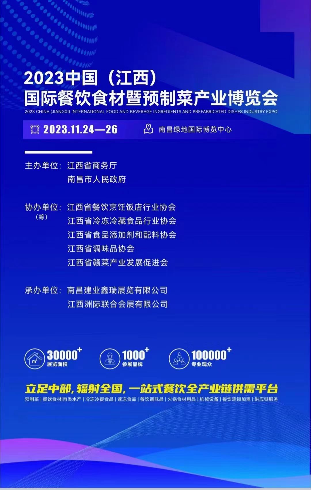 2023中国(江西)餐饮食材展暨预制菜产业博览会”将于11月24日-26日在江西南昌绿地国际会展中心隆重举行!本次展会由江西南昌建业鑫瑞展览有限公司承办,1000家餐饮品牌 ,聚焦预制菜革命,旨在深度探索和思考预制菜行业,助推预制菜赛道跑出国民级品牌。