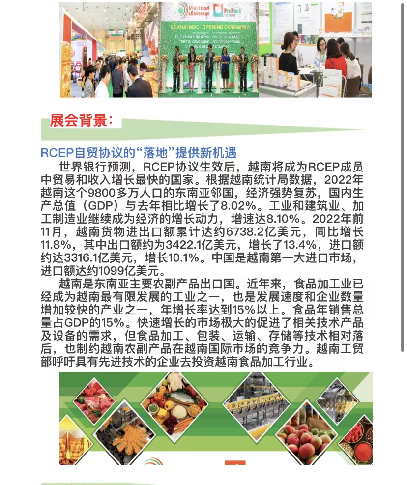 * FOOD & BEVERAGE &PROPACK VIETNAM 2023: 展会时间:2023年8月10-12日 展会地点:越南·胡志明市西贡国际会展中心(SECC) 展会规模:850个展位 协办单位:越南贸易促进会、越南饮料协会、越南水产加工及出口协会、越南食品协会、胡志明市食品协会 支持单位:越南工贸部、越南农业及农村发展部、越南卫生部、越南食品标准委员会、越南国家标准检验局支持 组织单位:越南工贸部贸易广告博览公司 中国组展:广西博越展览有限公司