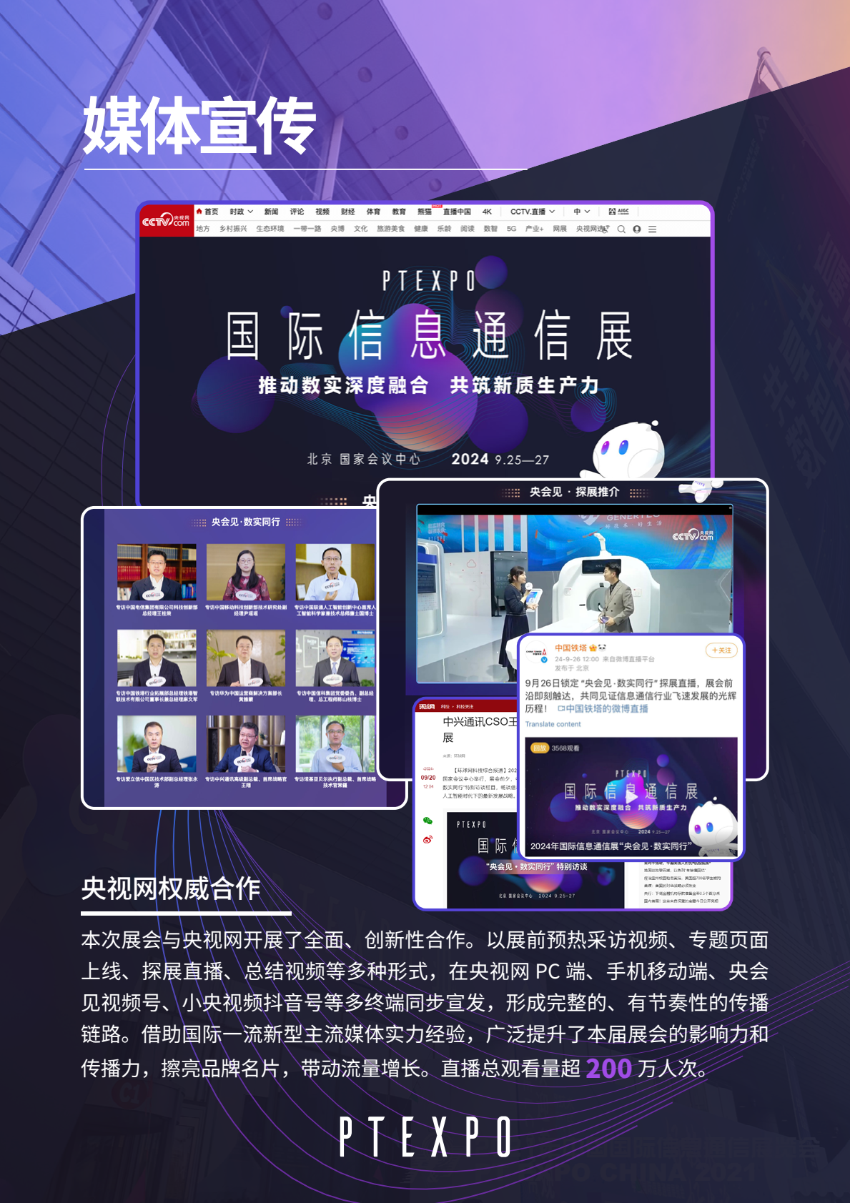 PT展自1990年开始举办,是反映信息通信行业发展新成果的重要窗口、促进全球信息通信领域交流合作的重要桥梁,被誉为行业发展的晴雨表和技术演进的风向标。30多年来,PT展在见证行业升级的同时,始终坚持中国特色和国际视野,通过衔接重大国家战略、对接产业政策动态、聚焦前沿数字技术发展超势,调动全产业链践行突破创新理念,持续向全世界输出中国智慧与中国方案,为全行业搭建展示、交流、合作、共享的大舞台。