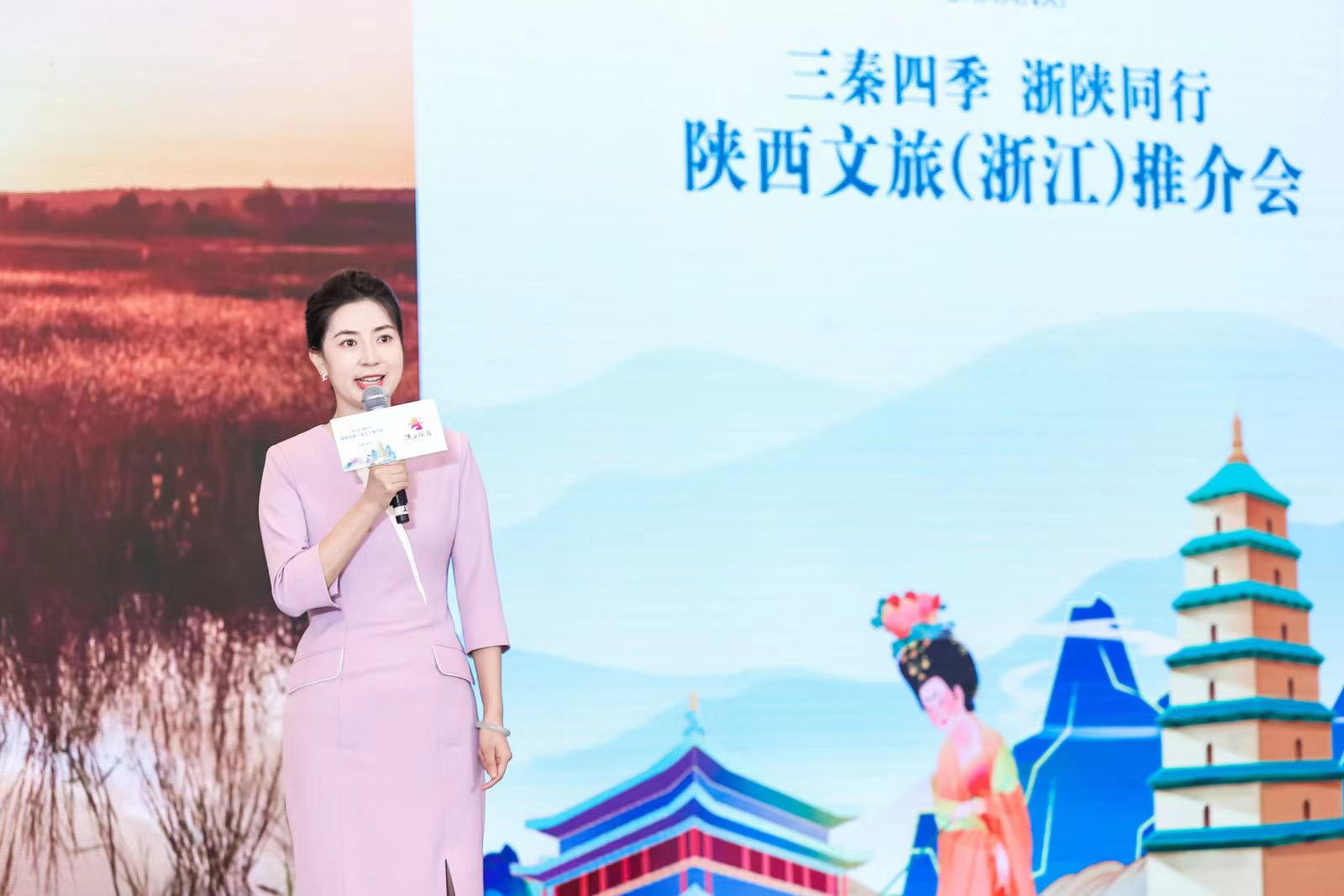 陕西金牌导游刘莉以经典诗词为引线,围绕“三秦四季”的自然风光、历史人文、非遗美食等主题,对陕西知名景区、精品线路、名胜古迹等进行分享,引领现场观众一起朗诵经典诗词,让来自浙江的嘉宾真切感受到陕西浓厚的历史文化。
