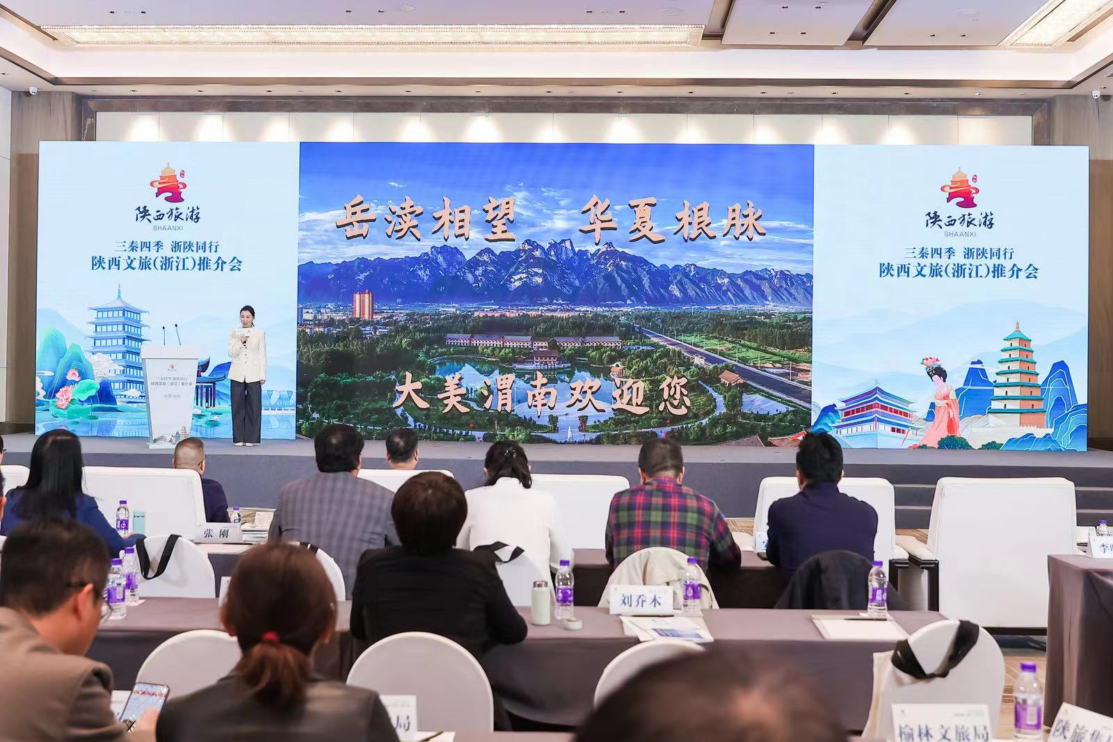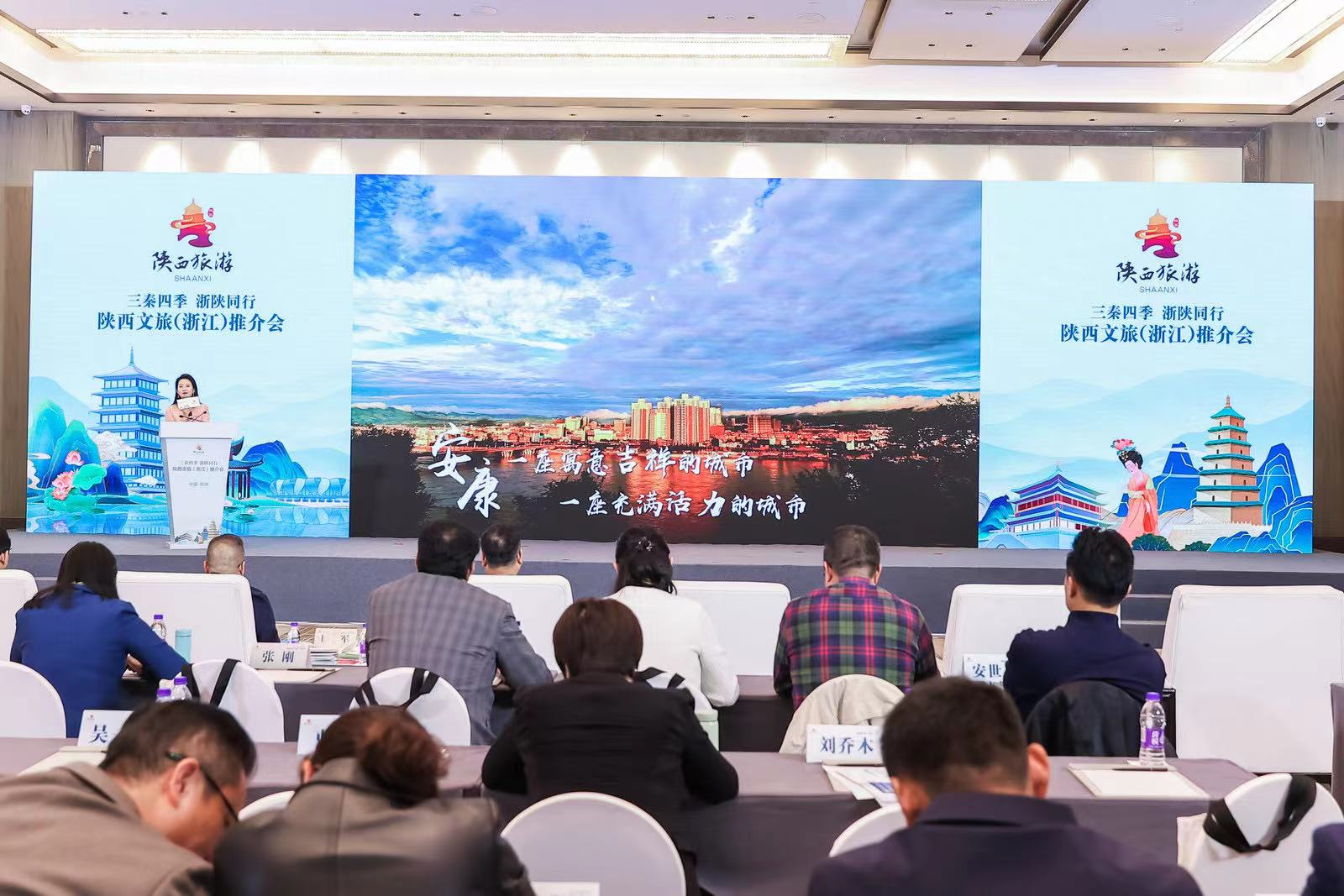 图文详情11月13日下午 ,由陕西省文化和旅游厅主办的陕西文旅(浙江)推介会在杭州市成功举办,现场推介“冬游陕西”特色旅游线路和优惠举措,介绍陕西各地文旅资源,对重点文旅项目进行招商,深入开展两地文化交流。来自浙江与陕西省文化和旅游厅、旅游协会、文化产业协会有关领导和负责人,浙江旅游投资集团、浙江演艺集团、浙江陕西商会、陕旅集团、陕文投集团等两地重点文旅企业和民营企业负责人,陕西省渭南市、铜川市、榆林市、安康市、西咸新区文旅局相关负责人,以及新闻媒体代表、浙江知名旅游达人、自媒体人近200人参加推介会。浙江省文化和旅游厅二级巡视员戴言、陕西省文化和旅游厅二级巡视员朱耀勋出席活动并致辞。