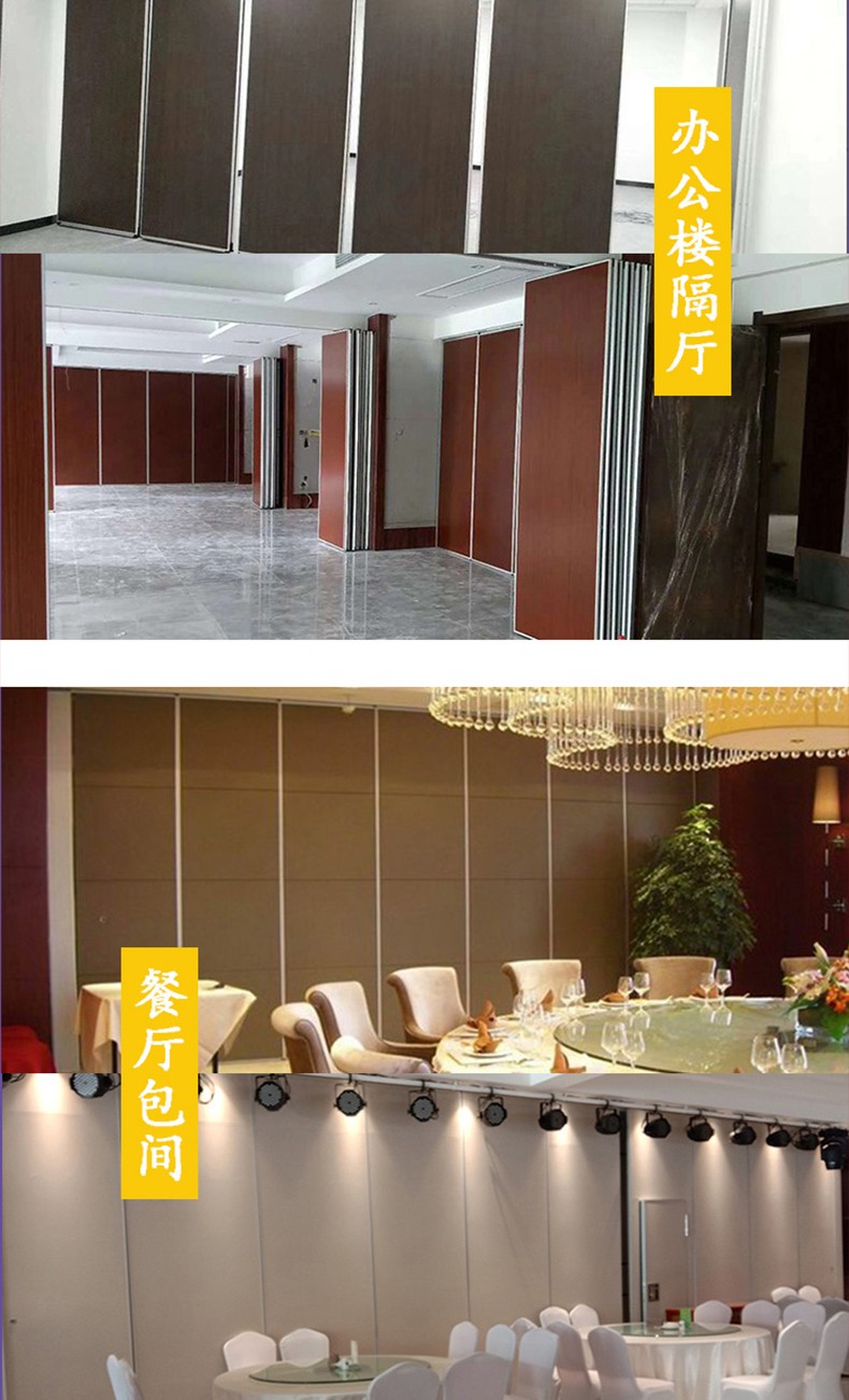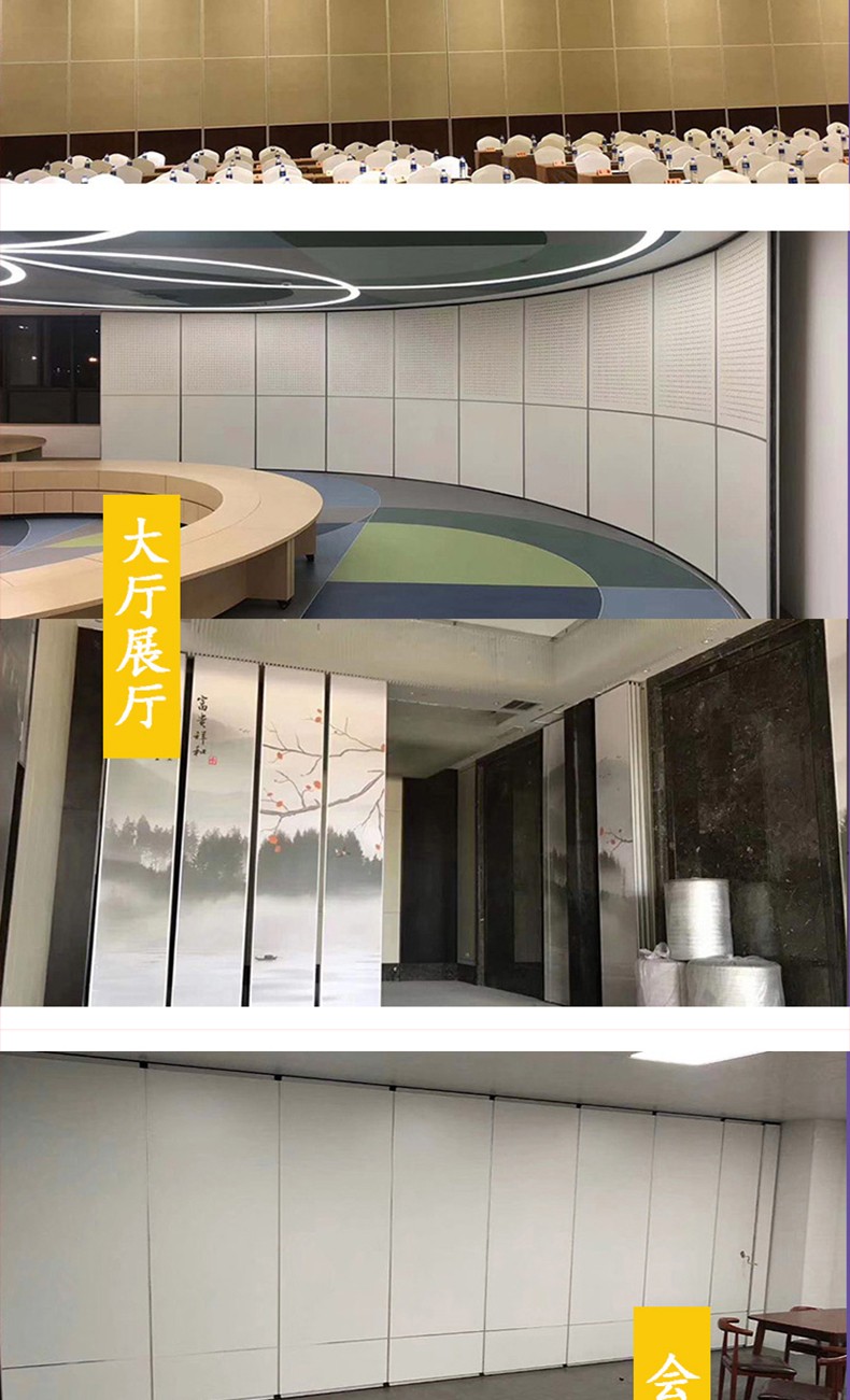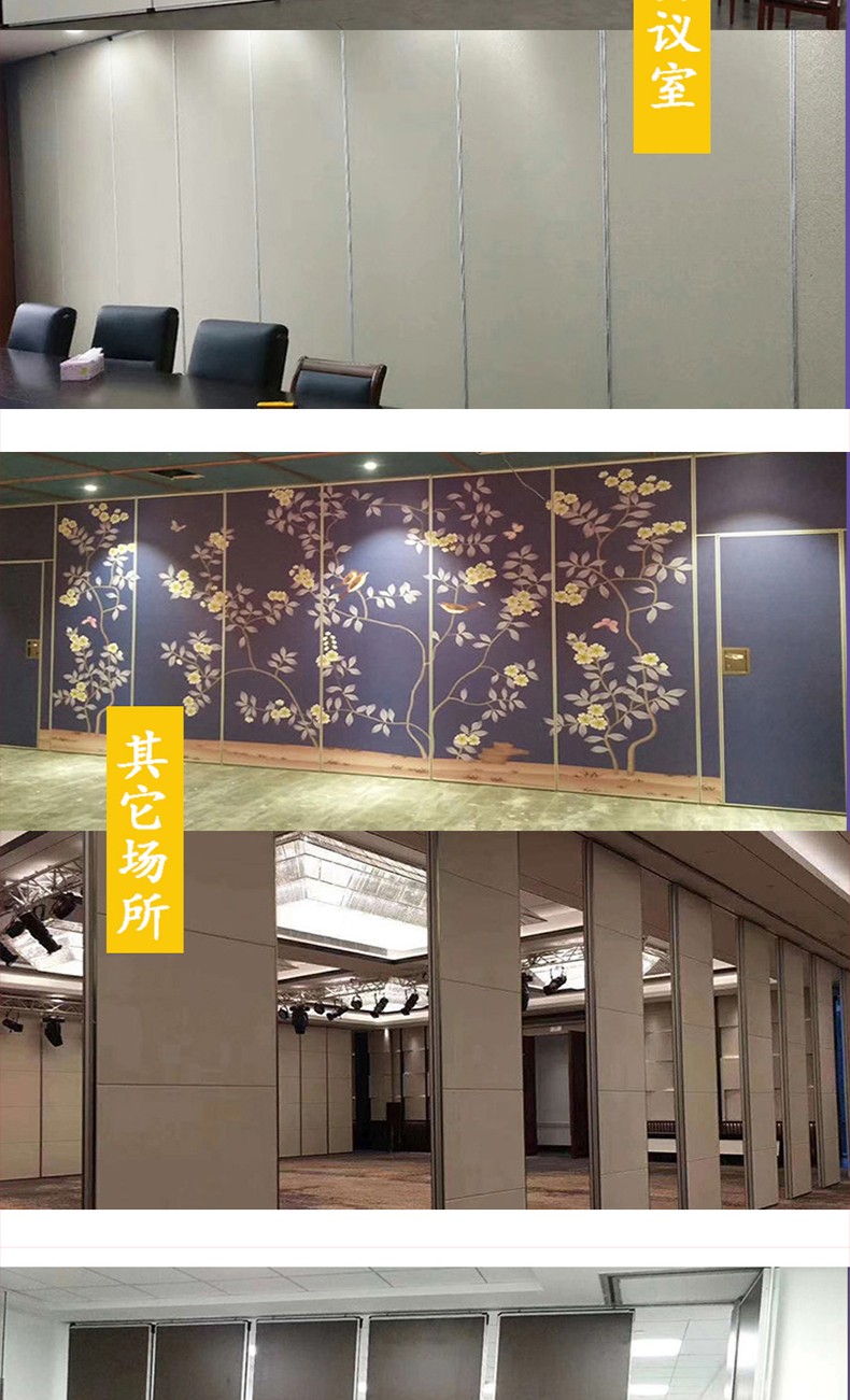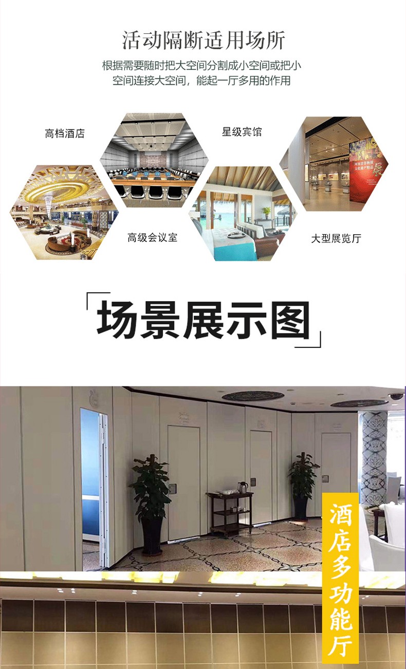活动隔断具有高隔音、防火、可移动、操作简单等特点。极为适合星级酒店宴会厅、高档酒楼包间、高级写字楼会议室等场所进行空间间隔的使用。目前,活动隔断、固定隔断系列产品已经广泛适用在酒店、宾馆、多功能厅、会议室、宴会厅、写字楼、展厅、金融机构、政府办公楼、医院、工厂等多种场合。  活动隔断可以分为:拼装式活动隔断、推移式活动隔断、折叠式活动隔断、悬挂式活动隔断。活动隔断是一种根据需要随时把大空间分割成小空间或把小空间连成大空间、具有一般墙体功能的活动墙。活动隔断具有以下特点:  1.无地轨悬挂:地板无轨道,只需将轨道安装于天花板上;  2.稳定安全:隔断后稳固可靠,不易摆动;  3.隔音环保:隔音效果好,最大隔音系数可达53dB;  4.隔热节能:隔热性能优良,根据不同入座率,把大空间分割成小空间,以降低空调电耗;  5.高效防火:采用高效防火材料制作,防火性能良好;  6.美观大方:表面任意装饰,可与室内统一装饰效果;  7.收放灵活:隔板收放自如,推动灵活,一个人就可以完成隔断整个过程;  8.收藏方便:收板时,隔板可以隐藏在专用储柜中,不影响整体美观;  9.应用广泛:可应用于会议厅、展览厅、餐厅、高洁净工厂和办公室等场所