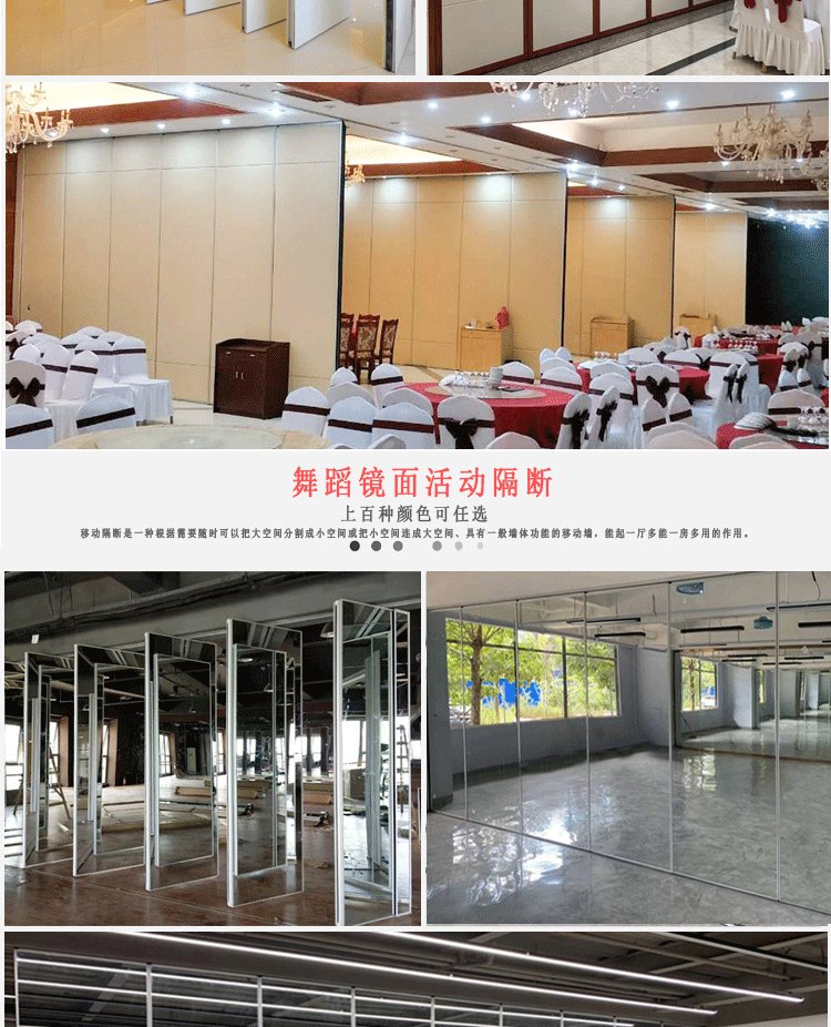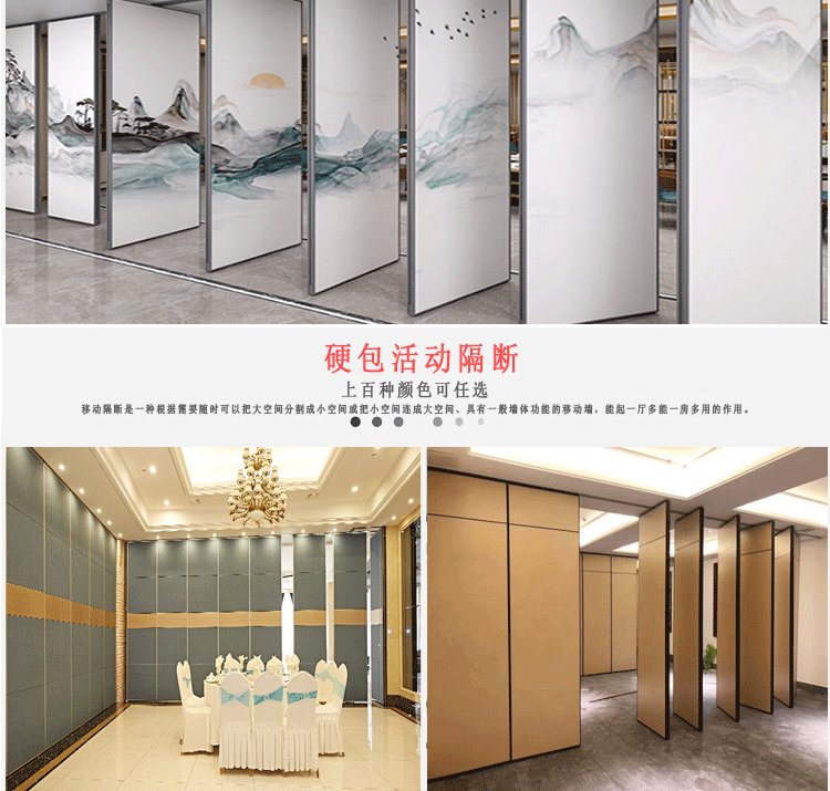 活动隔断具有高隔音、防火、可移动、操作简单等特点。极为适合星级酒店宴会厅、高档酒楼包间、高级写字楼会议室等场所进行空间间隔的使用。目前,活动隔断、固定隔断系列产品已经广泛适用在酒店、宾馆、多功能厅、会议室、宴会厅、写字楼、展厅、金融机构、政府办公楼、医院、工厂等多种场合。  活动隔断可以分为:拼装式活动隔断、推移式活动隔断、折叠式活动隔断、悬挂式活动隔断。活动隔断是一种根据需要随时把大空间分割成小空间或把小空间连成大空间、具有一般墙体功能的活动墙。活动隔断具有以下特点:  1.无地轨悬挂:地板无轨道,只需将轨道安装于天花板上;  2.稳定安全:隔断后稳固可靠,不易摆动;  3.隔音环保:隔音效果好,最大隔音系数可达53dB;  4.隔热节能:隔热性能优良,根据不同入座率,把大空间分割成小空间,以降低空调电耗;  5.高效防火:采用高效防火材料制作,防火性能良好;  6.美观大方:表面任意装饰,可与室内统一装饰效果;  7.收放灵活:隔板收放自如,推动灵活,一个人就可以完成隔断整个过程;  8.收藏方便:收板时,隔板可以隐藏在专用储柜中,不影响整体美观;  9.应用广泛:可应用于会议厅、展览厅、餐厅、高洁净工厂和办公室等场所