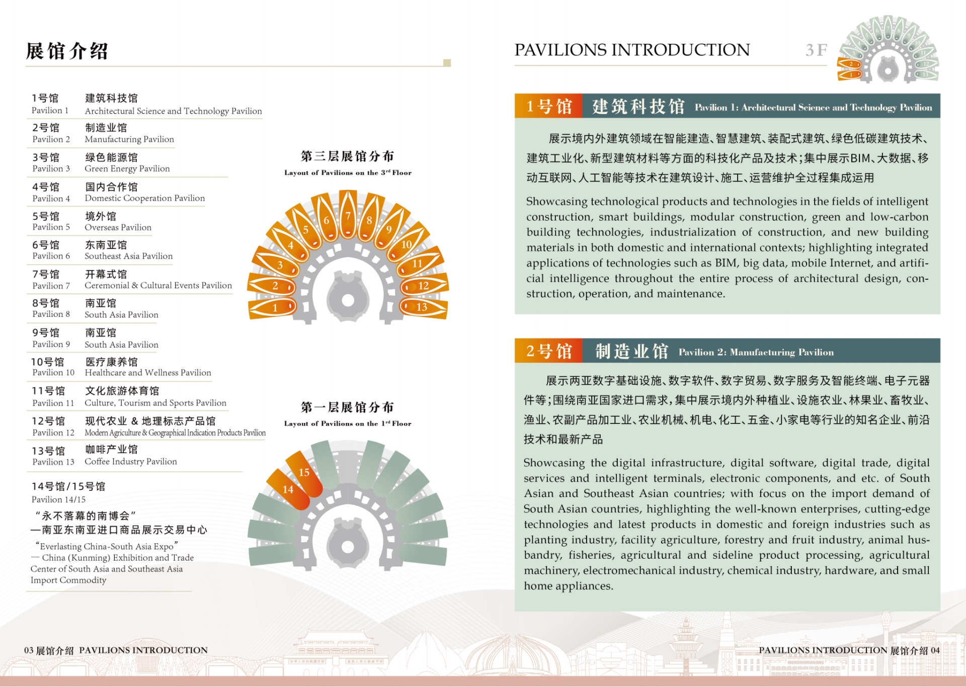 本届展会设置建筑科技馆、制造业馆、绿色能源馆、国内合作馆、境外馆、东南亚馆、开幕式馆、南亚馆(2个馆)、医疗康养馆、文化旅游体育馆、现代农业馆、咖啡产业馆、“永不落幕的南博会”(2个馆)等15个展馆,展览展示面积15万平方米。