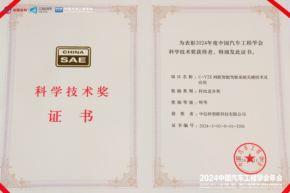 为表彰在推动行业科技进步中做出杰出贡献的单位和个人,中国汽车工程学会同期特别举办了首届中国汽车工程学会科学技术奖励大会暨高等级奖项技术分享会。由中国信科集团、中信科智联、中汽中心、中国一汽、蔚来汽车、东风悦享、北京车网、国汽(北京)智联等单位联合申报的“C-V2X 网联智能驾驶系统关键技术及应用”荣获2024年度中国汽车工程学会科学技术奖-特等奖,彰显以上科研团队为智能网联车产业发展作出的突出贡献。此奖不仅是对获奖者的荣誉认可,更是对整个行业创新精神的一次集中展示,激励着更多科研人员和团队为汽车科技的进步贡献力量。